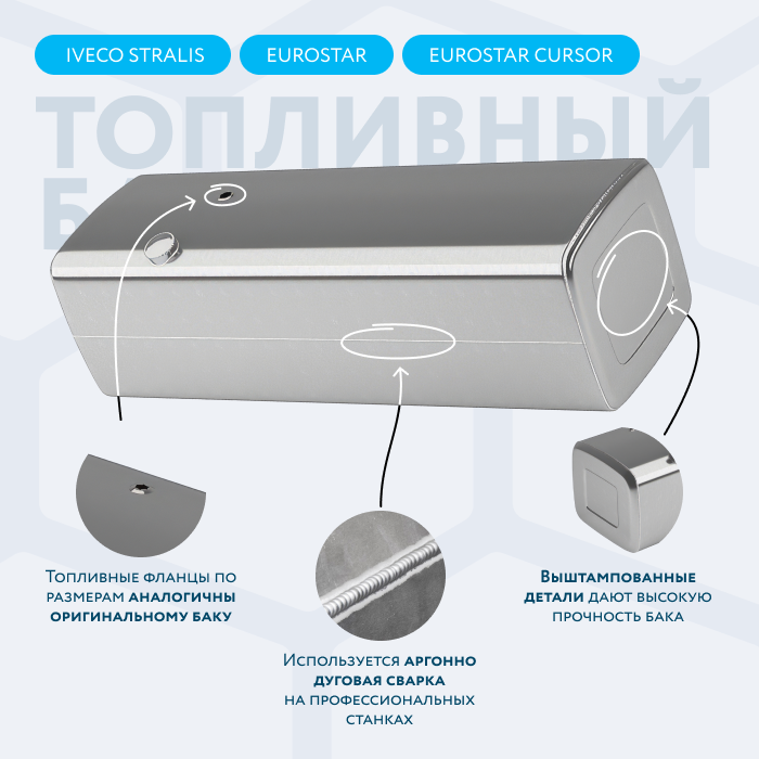 Алюминиевый бак не подвержен коррозии, что делает его более долговечным, а так же сбережет вашу топливную систему. Бак из алюминия в два раза легче стального бака, хотя он и изготовлен из листа увеличенной толщины в 2,5 мм. В конструкции предусмотрены цельные перегородки, которые проварены по периметру. Баки из алюминия так же оснащены заливной горловиной с самозапираемым непроливаемым клапаном (который становится барьером для разлива топлива, а так же становится защитой от попадания мусора в бак при открытой крышке) . Кроме того, однозначно что алюминиевый бак выглядит намного привлекательнее и дороже - где бак в том числе становиться и элементом тюнинга автомобиля. На алюминиеввые баки действует увеличенная гарантия - 36 месяцев.