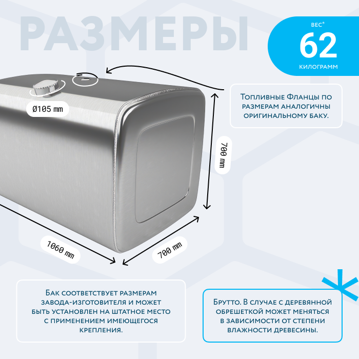 - Так же, если вы приобретаете алюминиевый топливный бак, он будет в деревянной обрешетке (для усиления защиты при транспортировке). При просчете веса и объема, цена за доставку может измениться по факту взвешивания на самом терминале транспортной компании. Так как деревянная обрешетка соответственно изготовлена из древесины, и она имеет свойство значительно набирать вес в зависимости от влажности окружающей среды.