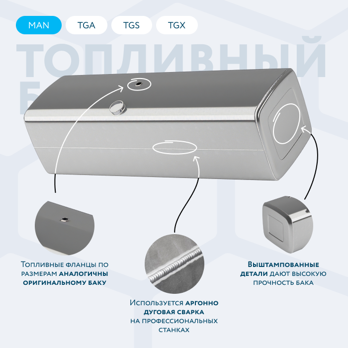 Все баки этого типа изготовлены из сортового алюминия увеличенной толщины 2.5 мм. Все топливные баки нашего производства прошли сертификационные испытания. Топливный бак Ман имеет паспорт и декларацию таможенного союза.. Гарантия 3 года.