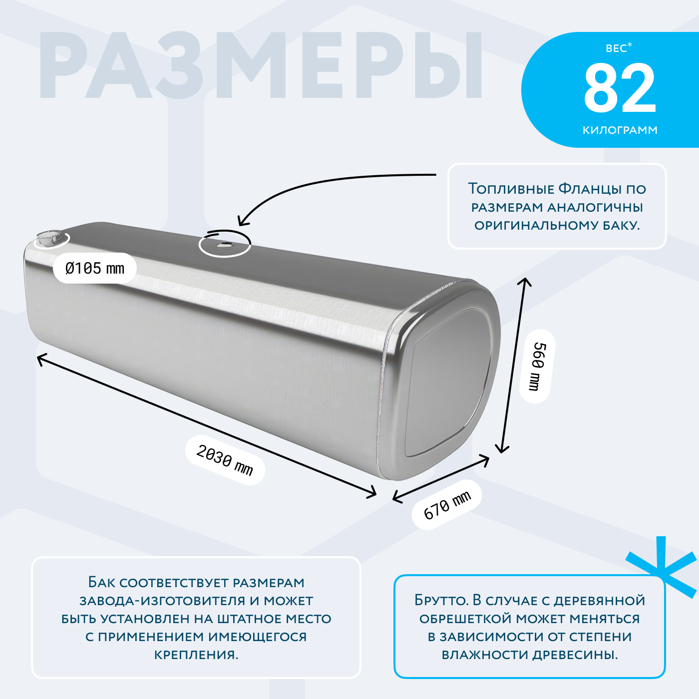 - Так же, если вы приобретаете алюминиевый топливный бак, он будет в деревянной обрешетке (для усиления защиты при транспортировке). При просчете веса и объема, цена за доставку может измениться по факту взвешивания на самом терминале транспортной компании. Так как деревянная обрешетка соответственно изготовлена из древесины, и она имеет свойство значительно набирать вес в зависимости от влажности окружающей среды.